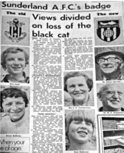 Lo stemma, invece, presente nel gagliardetto risalente ai primi anni Settanta abbandona il simbolo del gatto nero per dare prevalenza ad una simbologia che vuole, verosimilmente, mettere più in evidenza i colori societari e la connessione tra il calcio (raffigurato da un pallone) e la città vista nell’immaginario dall’imbarcazione in navigazione. Non tutti però erano d’accordo su questo cambiamento. Le cronache del giornale cittadino Sunderland Echo parlano, infatti, di differenti visioni sul nuovo stemma con parte dei cittadini che avrebbero preferito rimanere fedeli al gatto nero.