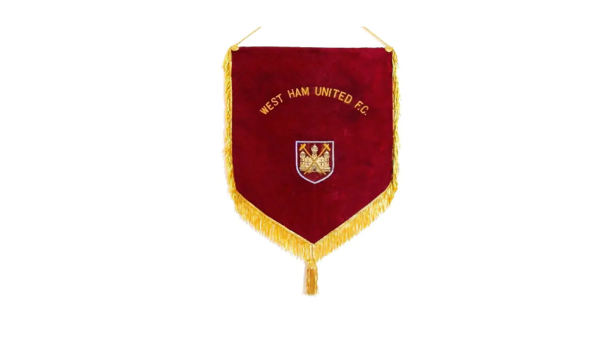 Ricordiamo la grandezza di questo club con un gagliardetto utilizzato tra la fine degli anni Sessanta e la prima metà degli anni Settanta. Granata con la scritta ricamata della denominazione del club in alto e con l’iconico stemma al centro che ripercorre decenni di vita della squadra. I martelli incrociati a rappresentare le origini della squadra. Questi rappresentavano gli operai dei cantieri navali del Tamigi e sono sovrapposti alla facciata del “Boleyn Castle” il castello abitato da Anna Bolena. Un maniero sito nei pressi del vecchio stadio dei “martelli”, il Boleyn Ground.