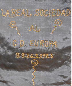 Per gli estesi e veri appassionati dei dettagli, come qualsiasi collezionista dovrebbe essere, il gagliardetto ha un ricamo a mano favoloso che sfoggia i simboli e la tradizione di una squadra che non ha mai variato la propria idendità rappresentata dallo stemma ed i colori bianco e blu. In aggiunta, in maniera desueta, su retro i ricami dei dettagli dell’incontro inseriti all’interno del ricamo di tre linee poste a risaltare le parole e ad impreziosire il dono presentato all’avversario : “ La Real Sociedad al C.D. Europa S.S. 26.2.1928”.