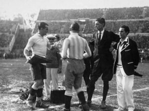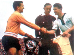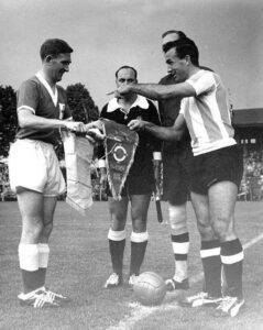Già proprio il giallo il colore protagonista di un evento davvero bizzarro in occasione della partita Germania – Argentina. In quella circostanza, infatti, il fato – tramutatosi in un sorteggio per la casacca da utilizzare – impose all’Argentina di impiegare una divisa diversa da quella principale. Purtroppo la comitiva argentina era del tutto impreparata al cambio di maglia e per ovviare all’inconveniete corse in riparo il Malmoe, società sportiva locale, che concesse all’albiceleste una muta gialla, proprio come il colore del retro del gagliardetto ma, soprattutto, della stessa tonalità del cosiddetto “Sole de Mayo” simbolo che spicca al centro della bandiera argentina.