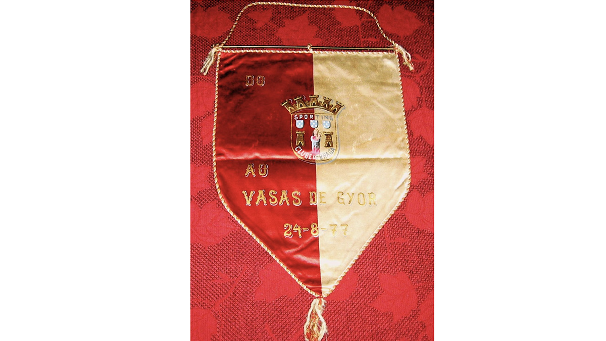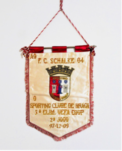 L’esemplare di gagliardetto in esame risale ad una amichevole che la formazione portoghese giocò nel 1977 contro gli ungheresi del Vasas. Un gagliardetto davvero fine ed in linea con la tradizione dello Sporting Braga. Questo perché la società portoghese, sin dagli anni Quaranta, realizzò gagliardetti dipinti a mano. Il formato, però, cambio nel corso degli anni. Dal triangolare degli anni Quaranta al pentagonale, tipologia di gagliardetto che usarono fino agli inizi dei Novanta. Caratteristica comune, oltre alla partitura in bianco e rosso con lettere dipinte in colorazione dorata, lo stemma della squadra che come detto è un inno alla “Nostra Signora di Braga” venerata dalla cittadinanza ed in tutto il Portogallo.