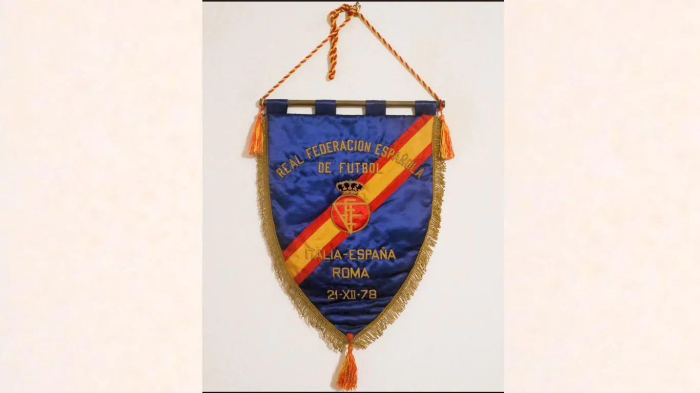 L’ultima curiosità è quella della presenza del Presidente Pertini all’incontro. Direi che anche in questa circostanza uno dei Presidenti più amati non mancò di essere vicino agli azzurri. Mancavano quattro anni al mondiale di Spagna ed all’indimenticabile gesto “non ci prendono più, non ci prendono più” del nostro amatissimo Presidente. Last but not least il gagliardetto. A margine della dimenticanza, ci troviamo davanti ad un esemplare di una raffinetezza unica. Sono presenti dei dettagli curatissimi, in più c’è un ricamo che a distanza di anni mantiene ancora vivacissimi i colori del filo metallico utilizzato. La corona che sormonta il monogramma della Federazione iberica è davvero lo straordinario che diventa ordinario per questi gagliardetti che un’azienda di Madrid ha prodotto per anni per la nazionale spagnola.
