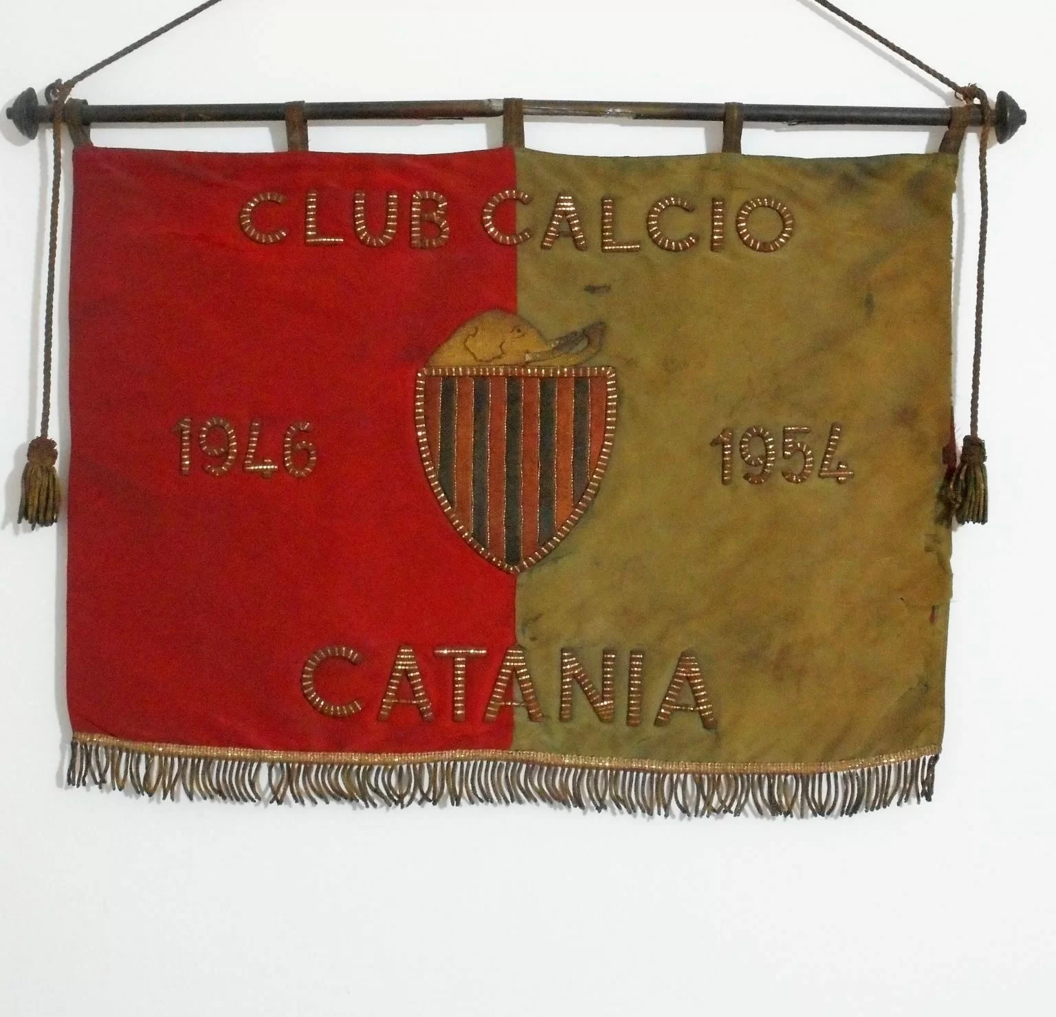 Passiamo ora a parlare dell’insegne del Catania Calcio con una breve rassegna di alcuni gagliardetti che hanno contraddistinto la storia della squadra etnea. Il primo esemplare è il labaro realizzato nel 1954, non un anno casuale nella storia dei rosso – azzurri. Il Catania, infatti, proprio in quell’anno approda per la prima volta in serie A. Il gagliardetto o per meglio dire il labaro che viene realizzato è pienamente rispondente, per bellezza del ricamo e la finitura dei dettagli, all’importante traguardo sportivo raggiunto. Molto oculata anche la scelta di combinare l’anno di costituzione del Club Catania Calcio (1946) con il 1954 a rappresentare, attraverso, due annate, la storia della squadra. Quella stagione terminò in modo infausto per il Catania che, per effetto di un illecito sportivo, fu costretto ad un’immediata retrocessione nella serie cadetta.