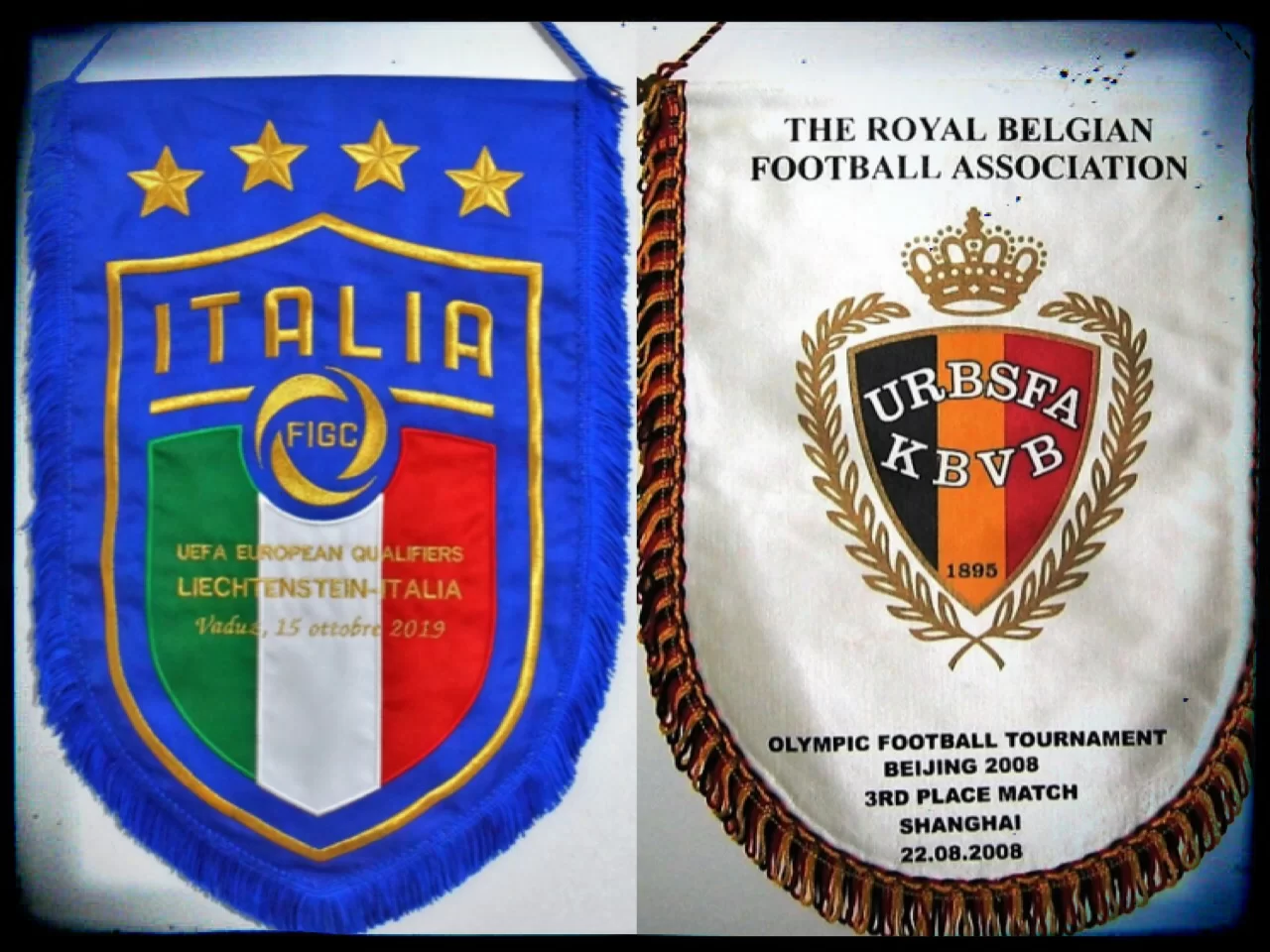 Per il Belgio, invece, il gagliardetto della finale per il terzo posto del torneo di calcio dei Giochi olimpici di Pechino del 2008. In quel torneo i “diavoli rossi” incrociarono nei quarti gli azzurri riuscendo a batterli per 3-2. Venerdì sera, tuttavia, il capitano belga consegnerà a quello azzurro un gagliardetto diverso da quello mostrato. Nell’anno in corso, infatti, il Belgio, in occasione del 125° anniversario della fondazione della propria federazione calcistica, ha deciso di cambiare logo. Conseguentemente anche il gagliardetto cambia fisionomia e decisamente in meglio rispetto a quelli utilizzati almeno fino al 2020.