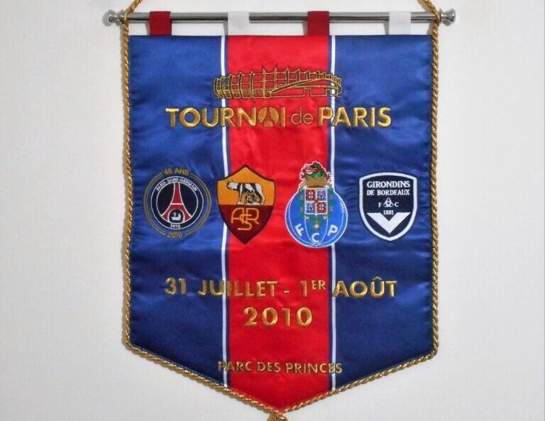 These symbols are also displayed on the team’s pennants as in the one made for the Paris Tournament, a quadrangular in which Roma also participated, which was played in the summer of 2010 to mark the fortieth anniversary of the club’s foundation. This pennant that PSG delivered to Porto and Girondins de Bordeaux, teams met in the competition, shows the crests of all the participants together with the profile of the Parco dei Principi, the home of PSG. For those who love statistics, that tournament, the first edition of which dates back to 1957, ended with the success of the Girondins de Bordeaux who beat PSG in the final.