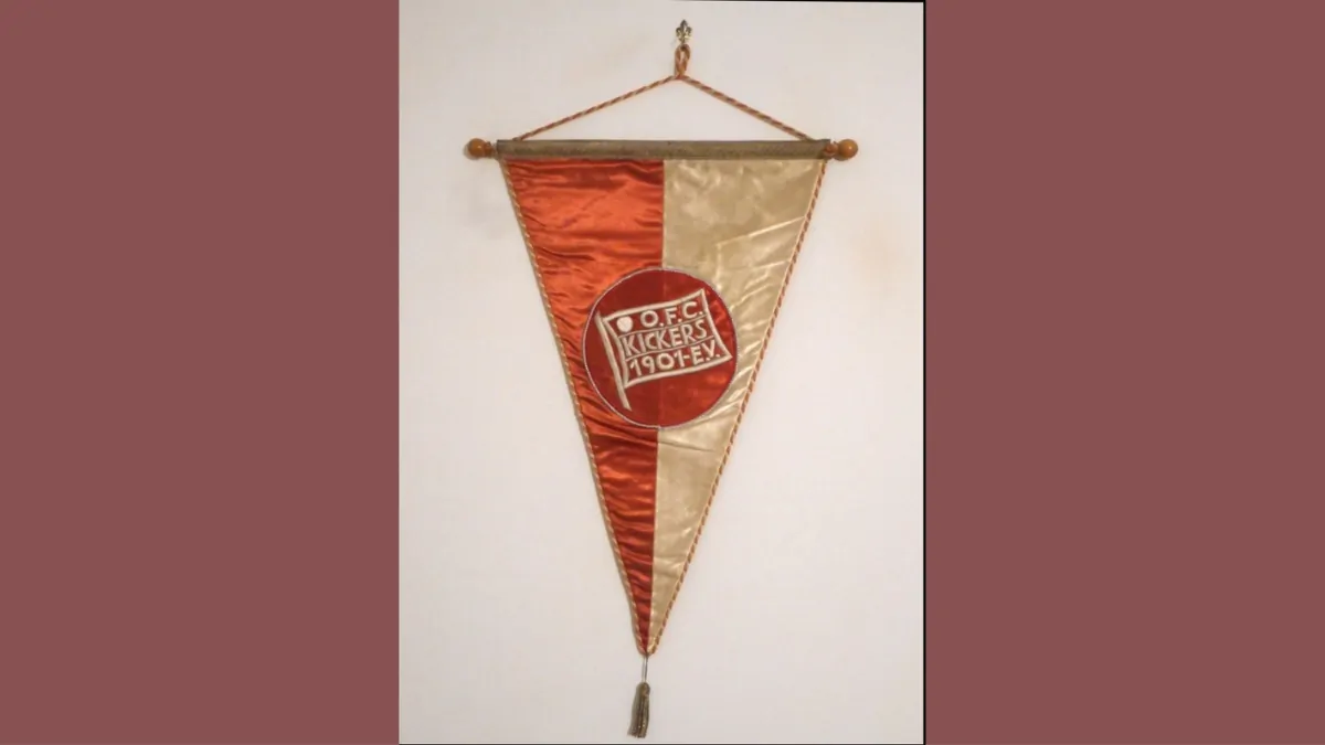 I Kickers nascono, nel 1901, dall’accorpamento di cinque compagini della cittadina di Offenbach località a poca distanza da Francoforte nel Land dell’Assia. La storia del club raggiunse il suo apice negli anni Cinquanta. In quel periodo, sfiorò, in due occasioni, la vittoria del campionato tedesco. Si affermò nella stagione 1969 – 1970 in Coppa di Germania, il trofeo di maggiore importanza conquistato dai bianco rossi. Il gagliardetto odierno è l’esemplare che venne consegnato prima dell’amichevole disputata il 29 agosto 1956 contro il Barcellona di Kubala, Ramallets e Saurez.