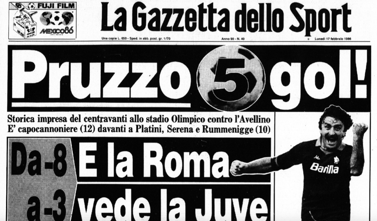 É Il 16 febbraio 1986 e all’Olimpico è di scena l’Avellino di mister Robotti. Il primo tempo non fa pensare a scenari molto rosei per la Roma, la prima frazione si chiude infatti col punteggio di 1-1 con il gol iniziale di Pruzzo su calcio di rigore e la risposta biancoverde firmata dall’otttimo Ramon Diaz. Nella ripresa, l’Avellino riesce a resistere nei primi minuti della ripresa dopo di che il centravanti di Crocefiaschi decide di scrivere la storia, sfoggiando tutto il suo repertorio: al 12’ insacca di testa su punizione-cross di Bruno Conti, al 24’ imbeccato da Boniek in azione di rimessa, dribbla il portiere Ferroni e infila la terza rete di sinistro, al 42’ ribadisce in rete una conclusione di Gerolin respinta da un giocatore avellinese, e solo due minuti più tardi completa la cinquina ancora su calcio di rigore, concesso per fallo di mano di un