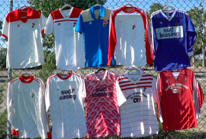 Passiamo alla parte relativa ai galletti. Qui Francesco Girone è il maestro incontrastato … “Abbiamo voluto ricostruire la storia del Bari, partendo dalla Pouchain. Quella con la fascia rossa, quella col righino e quell’azzurra, per anni una chimera. Nel 1980/81 poi compare Adidas che sarà presente anche nelle bellissime versioni ’84/’85, con sponsor Cassa di Risparmio di Puglia. Con questo sponsor siamo ritornati in Serie A, con la Sud Leasing abbiamo vinto l’unico trofeo della nostra storia, la Mitropa Cup. Le più rappresentative appartenenti a quell’epoca sono quella di Scarafoni (con manica a trequarti) e la versione stile Olanda ’88 di colore rosa/rosso”.