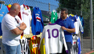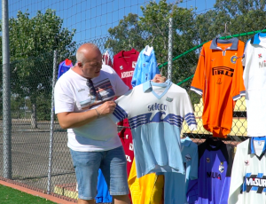 Poi sale in cattedra Francesco che, da buon professore universitario, inizia a sciolinare sapienza tecnica sulle divise di quel tempo … “Oltre alla Roma, Roberto ha la fortuna di avere una Phonola appartenuta a Mancini e una Opel di Roberto Antognoni, peraltro bianca. Tutti capi iconici. C’è anche una Pouchain dell’Udinese dell’era Zico. La Pouchain è stata l’azienda che ha portato in Italia il merchandising sportivo grazie ai Roma Point”.