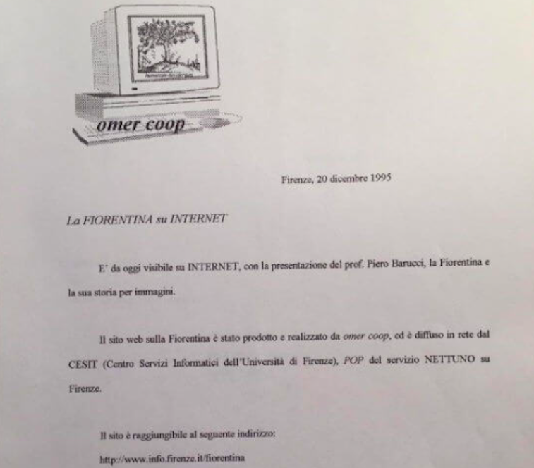 […] Nel 1995, una piccola impresa fiorentina di servizi informatici, Omer coop, in collaborazione con il Centro Servizi Informatici (Cesit) dell’Università di Firenze, realizzò infatti un sito web della Fiorentina che conteneva, tra l’altro, numerose informazioni sul club e la sua storia. […] Il sito, che si apriva con una presentazione del professor Piero Barucci, economista e già Ministro del Tesoro, venne presentato alla stampa e raccolse l’interesse dei media locali e nazionali.
