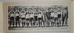 La formazione del Genoa di William Garbutt (primo a destra) nella stagione 1914-1915. La presenza di un uomo in divisa, tra i giocatori rossoblù ci segnala che la guerra è ormai alle porte (Fonte: Archivio Nuova Editrice Genovese).