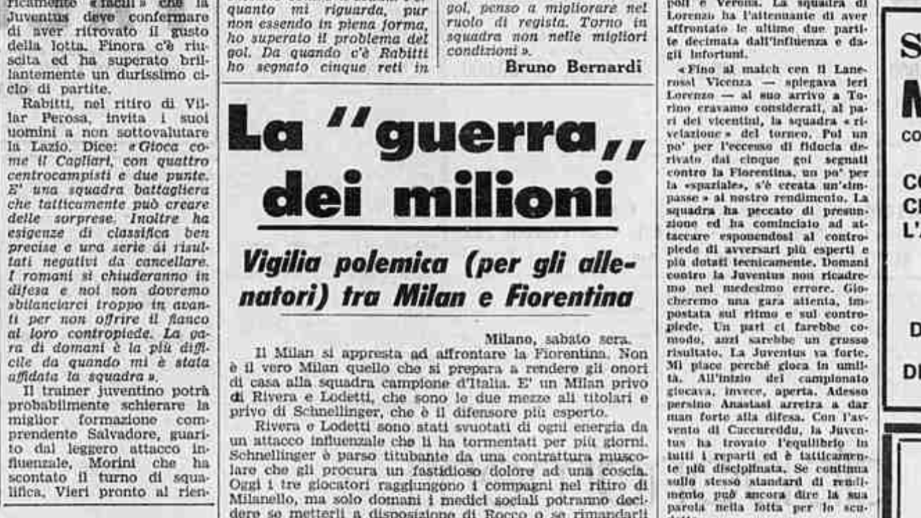 Insomma entrambi lanciano il guanto della sfida… Il match quindi, già importante di suo, si arricchisce di ulteriori spunti… durante la riunione del Consiglio direttivo della Lega, il Presidente del Milan, Carraro, attacca in maniera vigorosa e decisa il Presidente della Fiorentina Baglini, reo di aver “concesso all’allenatore Pesaola il rinnovo del contratto per la prossima stagione, a condizioni economiche da capogiro. Baglini avrebbe assicurato al suo tecnico, per la prossima stagione, un compenso globale di circa 90 milioni di lire e ciò ha fatto andare su tutte le furie Carraro, che è venuto a trovarsi in comprensibile imbarazzo nei confronti di Nereo Rocco, tacitato per il prossimo anno con un compenso di soli 30 milioni. Alle lamentele del presidente rossonero ha fatto eco il presidente della Federcalcio, Artemio Franchi, che ha parlato chiari, mirando palesemente contro la Roma. Il presidente romanista Marchini ad Helenio Herrera per il prossimo anno, ha assicurato addirittura un compenso di circa 200 milioni, e Franchi ha detto che la Federcalcio non potrà tollerare tali eccessi” (Cit. Stampa Sera, 20 dicembre 1969).