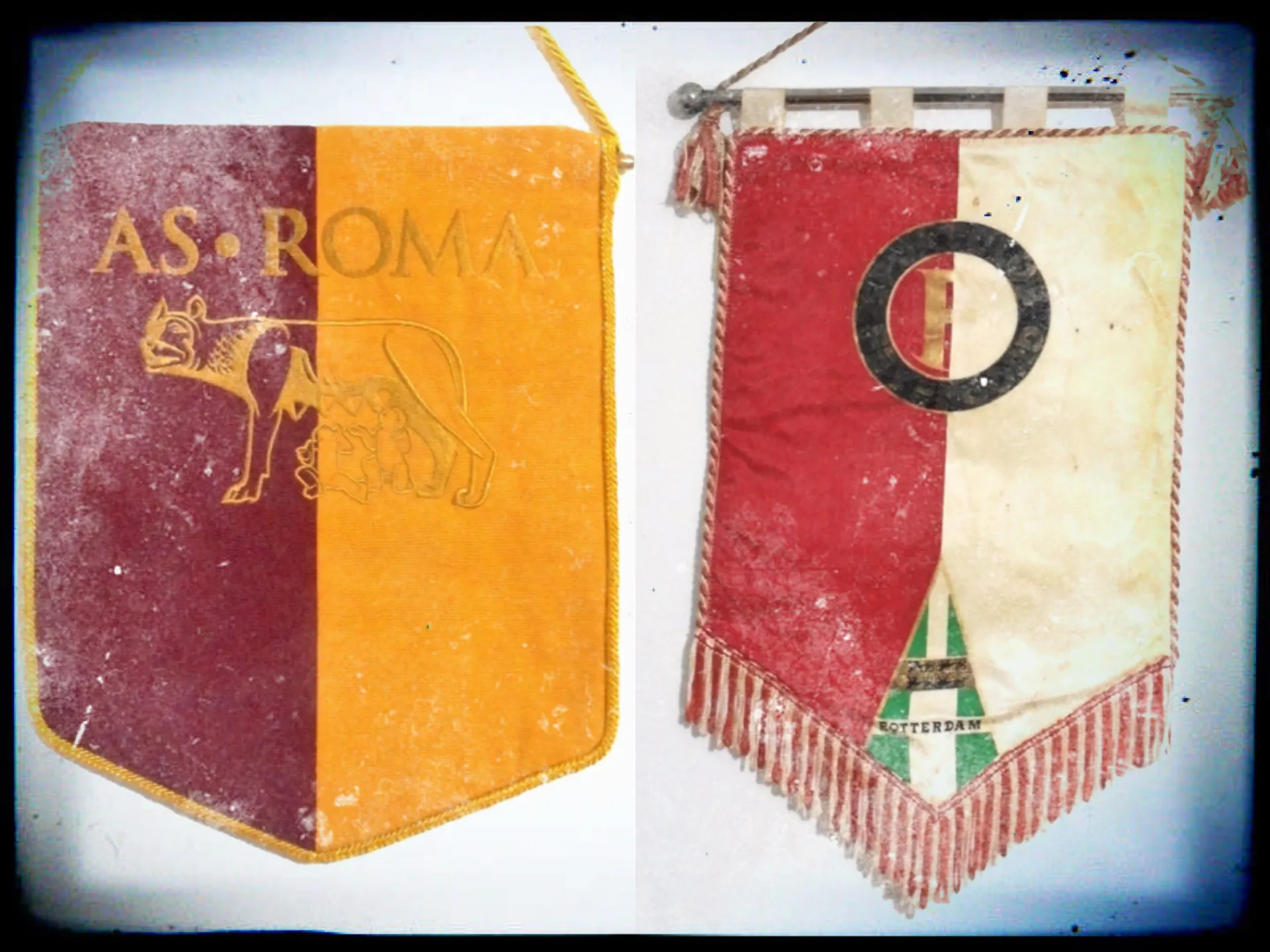 Da un lato un gagliardetto che la squadra di Rotterdam utilizzò a partire dalla fine degli anni Sessanta. Tradizione vuole che il Feyenoord sia stato fedelissimo al suo simbolo, una lettera F, tanto da utilizzarlo dalle origini fino ad oggi. Nel gagliardetto della foto è presente forse l’unica “divagazione” alla grafica dell’insegna per via della presenza dei simboli (in basso sul gagliardetto) della cittadina olandese.