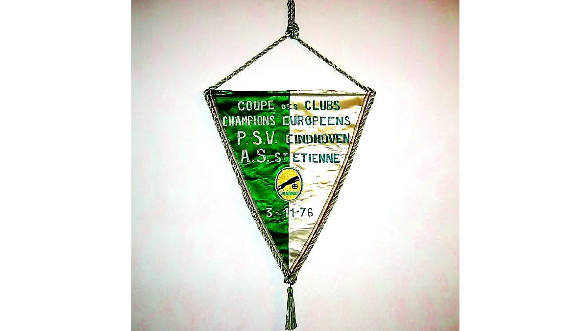 Questo stemma, sempre presente sui gagliardetti, accompagnò gli anni d’oro del club francese. Un periodo fatto di vittorie nel Campionato francese e nella Coppa Nazionale. Oltre a questi successi ci furono le ottime prestazioni nella Coppa dei Campioni dove il Saint Etienne raggiunse la finale nella stagione 1975 – 1976. Nell’ultimo atto si arrese al Bayern. Nella stagione seguente, invece, si fermò ai quarti di fronte al Liverpool poi vincitore. In quelle stagioni i gagliardetti utilizzati, finemente curati nei dettagli (corda perimetrale in bianco verde e pendaglio nella stessa tonalità), riportavano il ricamo dei dettagli dell’incontro in capo allo stemma del club e la data sottostante.