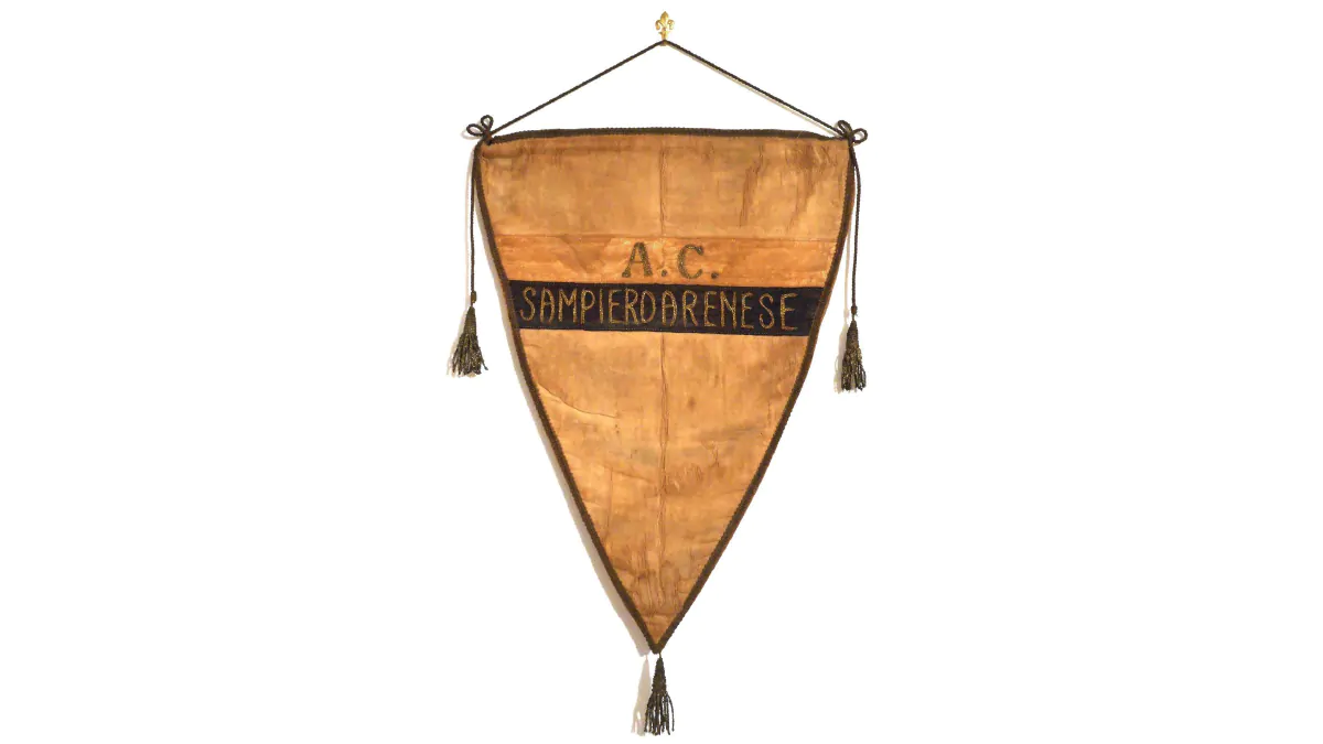 Il gagliardetto odierno ci riporta indietro di circa novanta anni ovvero agli anni trenta, periodo di massimo fulgore della squadra. Un esemplare semplice privo dello stemma. Nonostante questo è affascinante notare i segni del tempo che hanno oramai portato via lo sfondo bianco e la fascia rossonera centrale su cui è apposto il ricamo della denominazione societaria. Colori affatto banali in quanti ripercorrono l’intera tradizione della Società ligure. Il nero come la tonalità che fu utilizzata agli albori della squadra e per tutto il periodo precedente alla Prima Guerra Mondiale. Al termine del conflitto mondiale la Sampierdarenese iniziò le proprie attività nel 1919 assorbendo nelle proprie fila molti giocatori della disciolta Associazione del Calcio Ligure. Per onorare la società del quartiere di Bolzaneto alla fascia nera venne aggiunta quella rossa. Questa ricordava i fasti dell’A.C. Ligure, compagine a sua volta nata da un’ulteriore fusione che aveva interessato tre squadre genovesi.