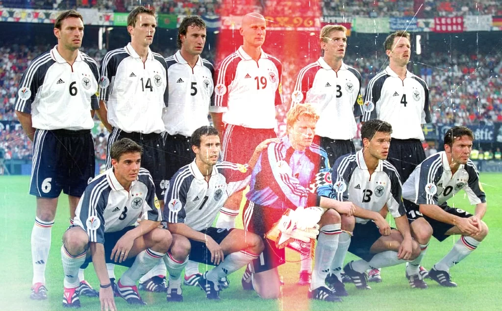 […] La grande Germania campione del mondo nel 1990 sta lentamente pensionando i suoi pezzi più pregiati, quasi tutti ormai vicini al ritiro e rimpiazzati da quei sostituti che in gran parte hanno già rappresentato lo zoccolo duro della nazionale che ha vinto gli Europei nel 1996. […] La rosa che Ribbeck porta ad Euro 2000 non ha i fenomeni di un tempo, in difesa c’è un Matthaus riciclato quasi al ruolo di libero, in porta è stato promosso Oliver Kahn (forse il vero fuoriclasse della squadra), la fantasia è affidata al guizzante Mehmet Scholl, mentre in attacco ci sono i classici panzer, Kirsten, Bierhoff e Jancker, ad alternarsi fra di loro. A dire il vero, la nazionale tedesca non sembra fra le migliori delle 16 qualificate alla manifestazione, anzi, l’impressione è che la Francia campione del mondo, l’Olanda padrona di casa, l’Italia di Zoff e forse anche Inghilterra e Spagna siano un gradino sopra ad una Germania senza stelle. […] L’esordio della nazionale tedesca è previsto per il pomeriggio del 12 giugno a Liegi contro la Romania nella partita che inaugura in gruppo A del torneo. I rumeni partono forte, spinti da tantissimi tifosi, e passano in vantaggio dopo appena 5 minuti grazie al centravanti Moldovan. La Germania prova a reagire, ma la Romania pare meglio disposta in campo e va pure vicina al raddoppio; altro detto calcistico: gol sbagliato, gol subìto. La Germania, scampato il pericolo ed il momento di bambola, raccoglie energie, coraggio, esperienza e pareggia al 28′ con un gran tiro di Scholl, dopodiché le due squadre pensano più a non perdere che a vincere e la gara termina 1-1. In serata, il Portogallo batte l’Inghilterra rimontando da 0-2 a 3-2 e la classifica dopo la prima giornata si configura coi lusitani in testa a quota 3, Germania e Romania a 1, Inghilterra 0. Logico, dunque, che Inghilterra-Germania in programma nel secondo turno sia una sorta di spareggio, perché chi dovesse perdere sarebbe con un piede e mezzo fuori dagli Europei ed un pareggio potrebbe comunque complicare le cose ad entrambe.