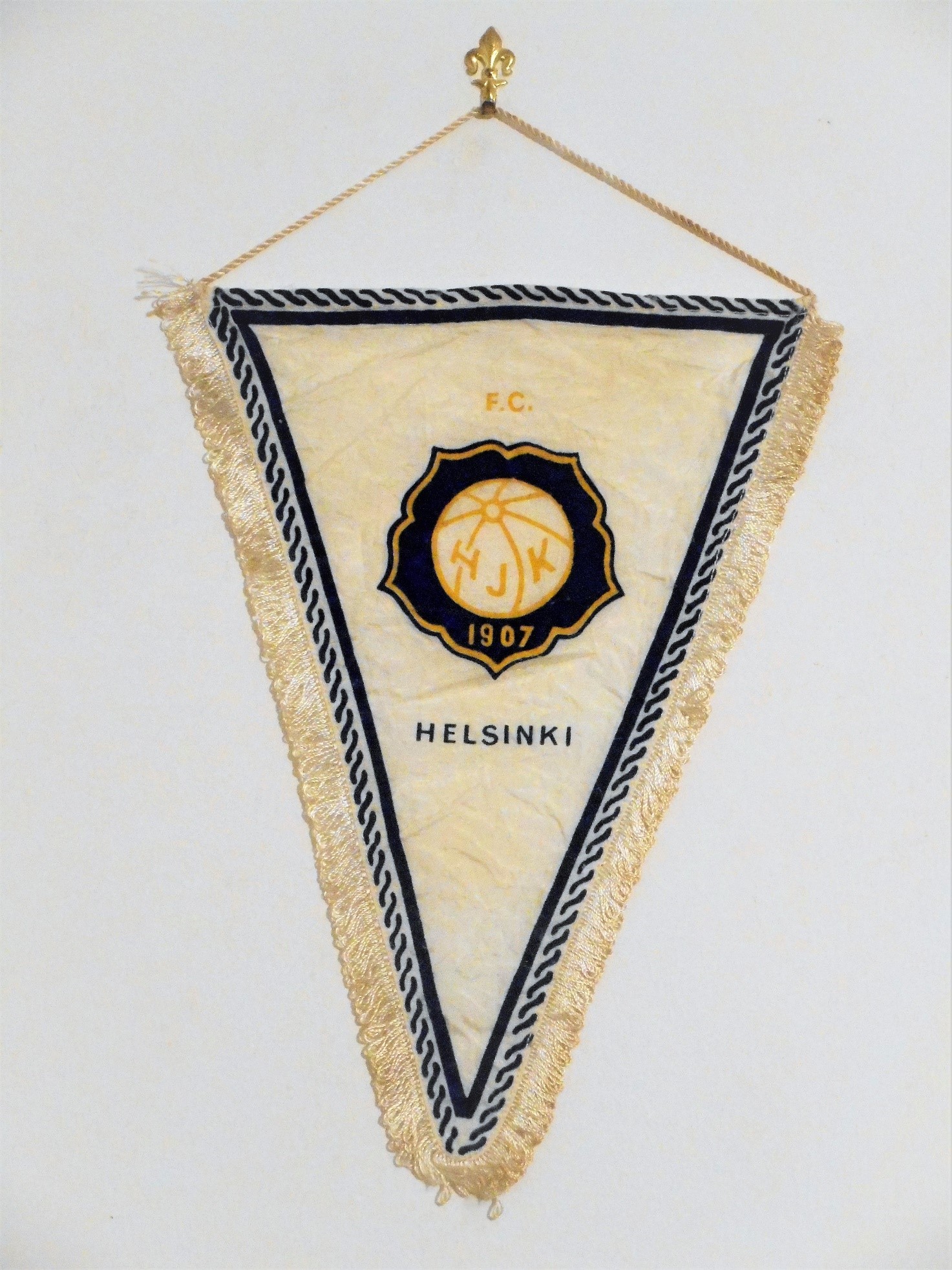 Il gagliardetto di oggi, verosimilmente in uso negli anni ottanta, riporta lo stemma del club ancora in uso costituito dalla forma di una pallone d’annata al cui interno è presente l’iscrizione HJK nonchè l’anno di fondazione. Questo gagliardetto, per dimensioni e fattura, veniva presumibilmente consegnato a ciascun giocatore avversario prima degli incontri ovvero utilizzato da parte delle squadre giovanili. Oggi lo stemma societario ha mantenuto grossomodo le stesse fattezze con l’aggiunta in testa al tradizionale pallone, a partire dal 2020, di cinque stelle d’oro. Questo è un caso unico al mondo poiché lo stemma della squadra riporta sia le tre stelle conquistate in virtù della trenta vittorie della squadra maschile che le venti conquistate dalla squadra femminile.