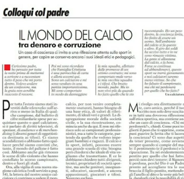 […] La notizia scuote ovviamente l’Italia del pallone, ma soprattutto giornalisti e tifosi iniziano ad interrogarsi su chi possa essere il “pentito”, anche perché il direttore di Famiglia Cristiana, don Antonio Sciortino, precisa immediatamente che motivi di riservatezza e rispetto della persona gli impediscono, anzi, gli impongono di non rivelare l’identità dell’individuo in questione, ma allo stesso tempo assicura che dubbi sull’autenticità del ruolo dell’anonimo lettore non ve ne siano.