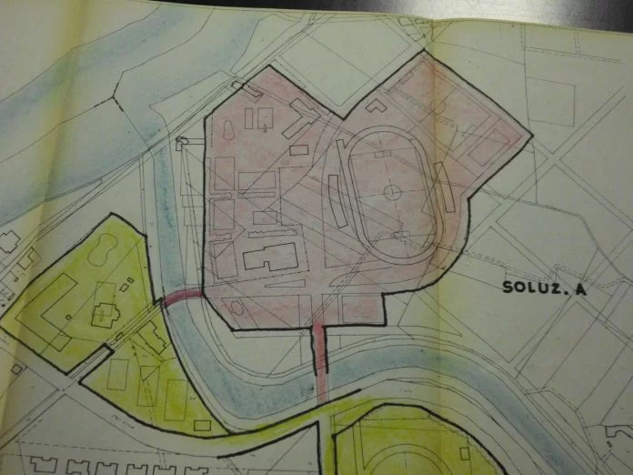 […] Il progetto per la costruzione di una nuova Zona Sportiva sarà approvato nel 1957 dal Ministero dei Lavori Pubblici e da quel momento l’Amministrazione Comunale inizierà le trattative per l’acquisizione (in via amichevole e con espropri) dei terreni necessari.