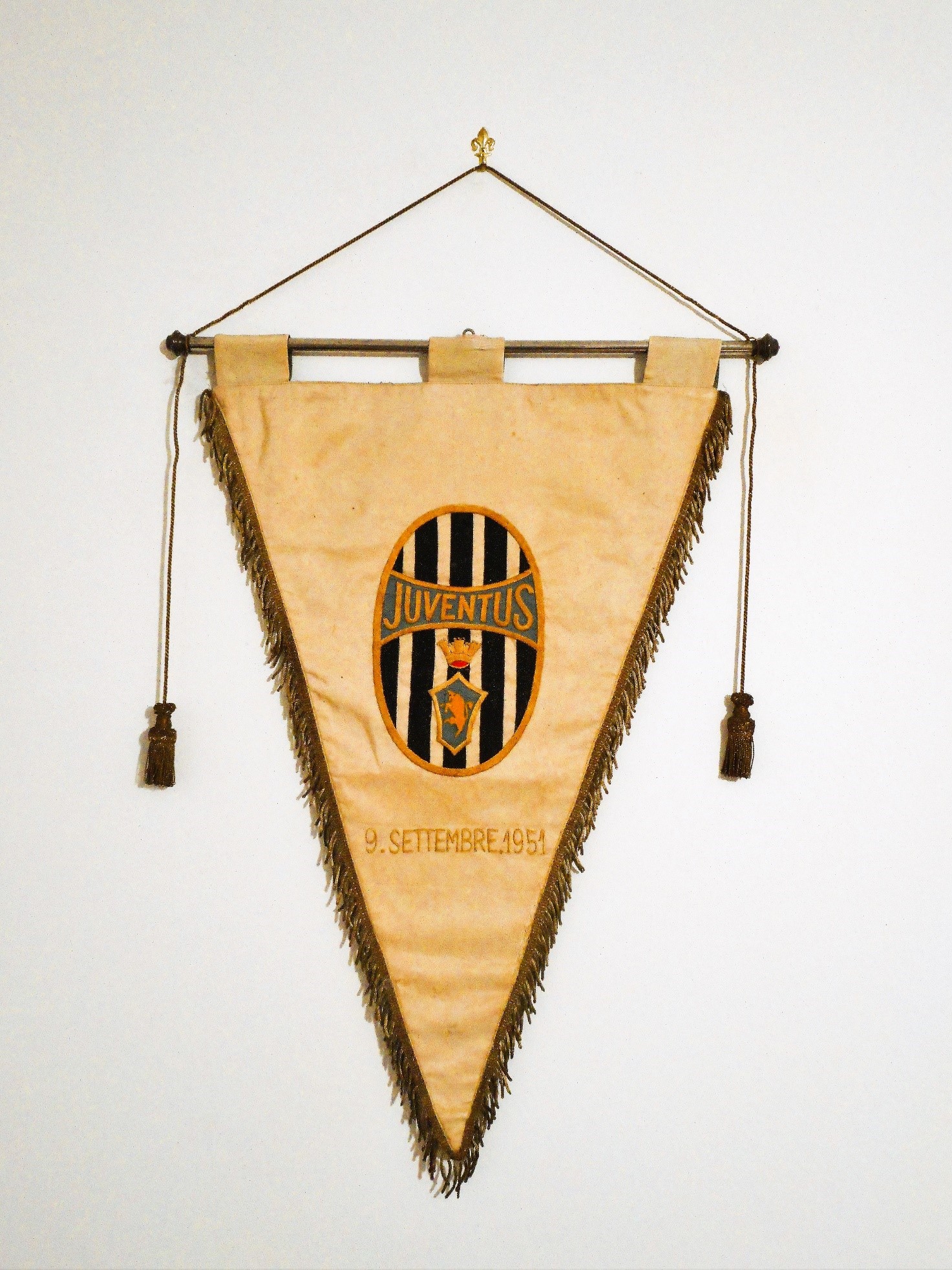 Quella prima giornata di 71 anni fa ora riaffiora ai nostri occhi attraverso lo splendido gagliardetto che venne consegnato alla Spal. Con l’iconico ovale a strisce bianconere e con lo stemma della città di Torino questa tipologia di gagliardetto accompagnò per decenni le gesta sportive della Juventus che, unica nel panorama nazionale, rimase fedele allo stile dei suoi gagliardetti peraltro “autarchici” in quanto sempre prodotti da ditte torinesi che rilasciavano testimonianza della loro partnership con la Juve apponendo sul retro del gagliardetto il loro marchio aziendale.