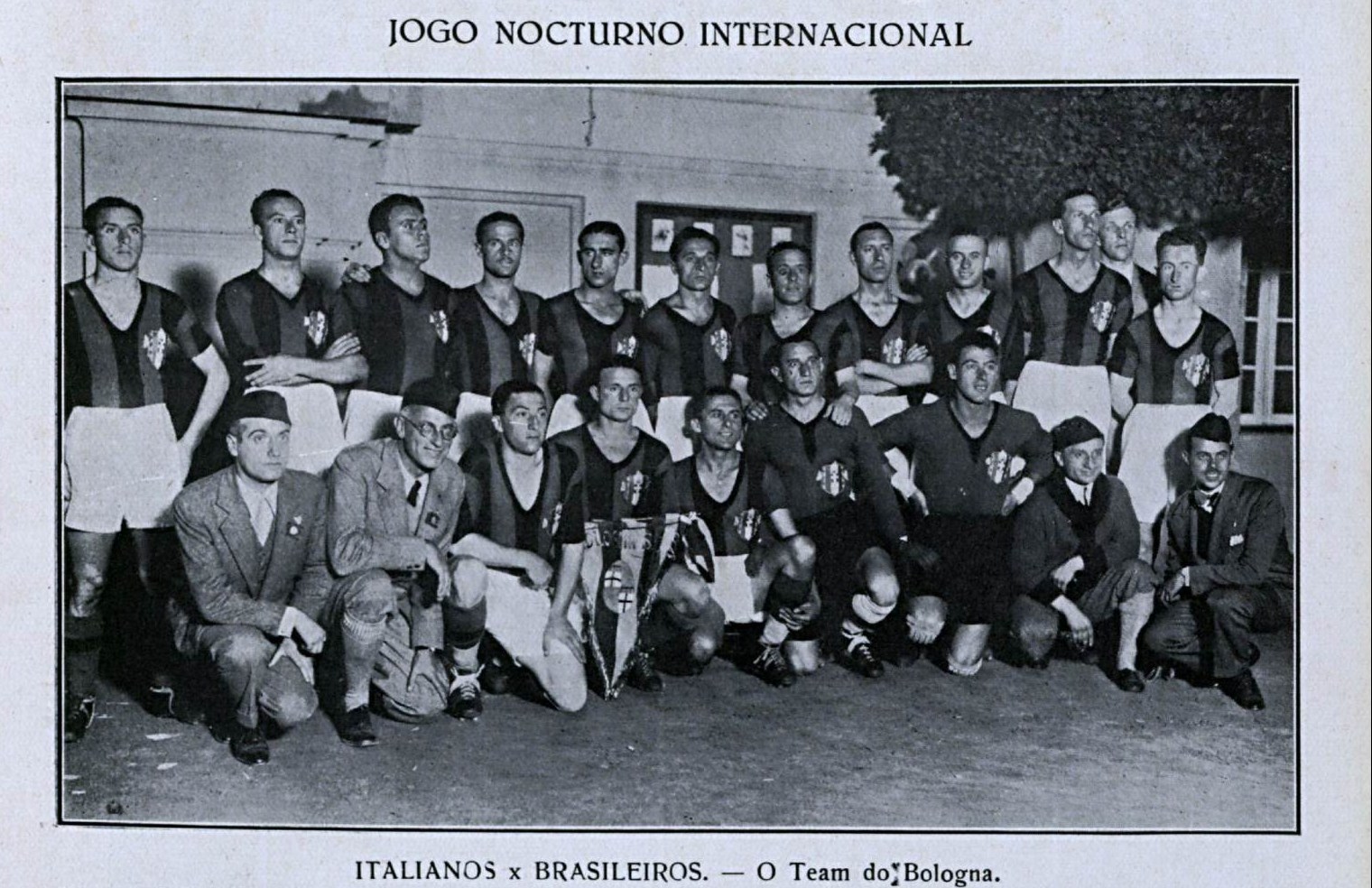 Un primo significativo cambiamento nell’aspetto dello scudetto avvenne l’anno seguente, quando sull’esempio della bandiera del Regno d’Italia fu aggiunto lo stemma sabaudo come si vede in questa foto del 1925-26 di Angelo Schiavio del Bologna.