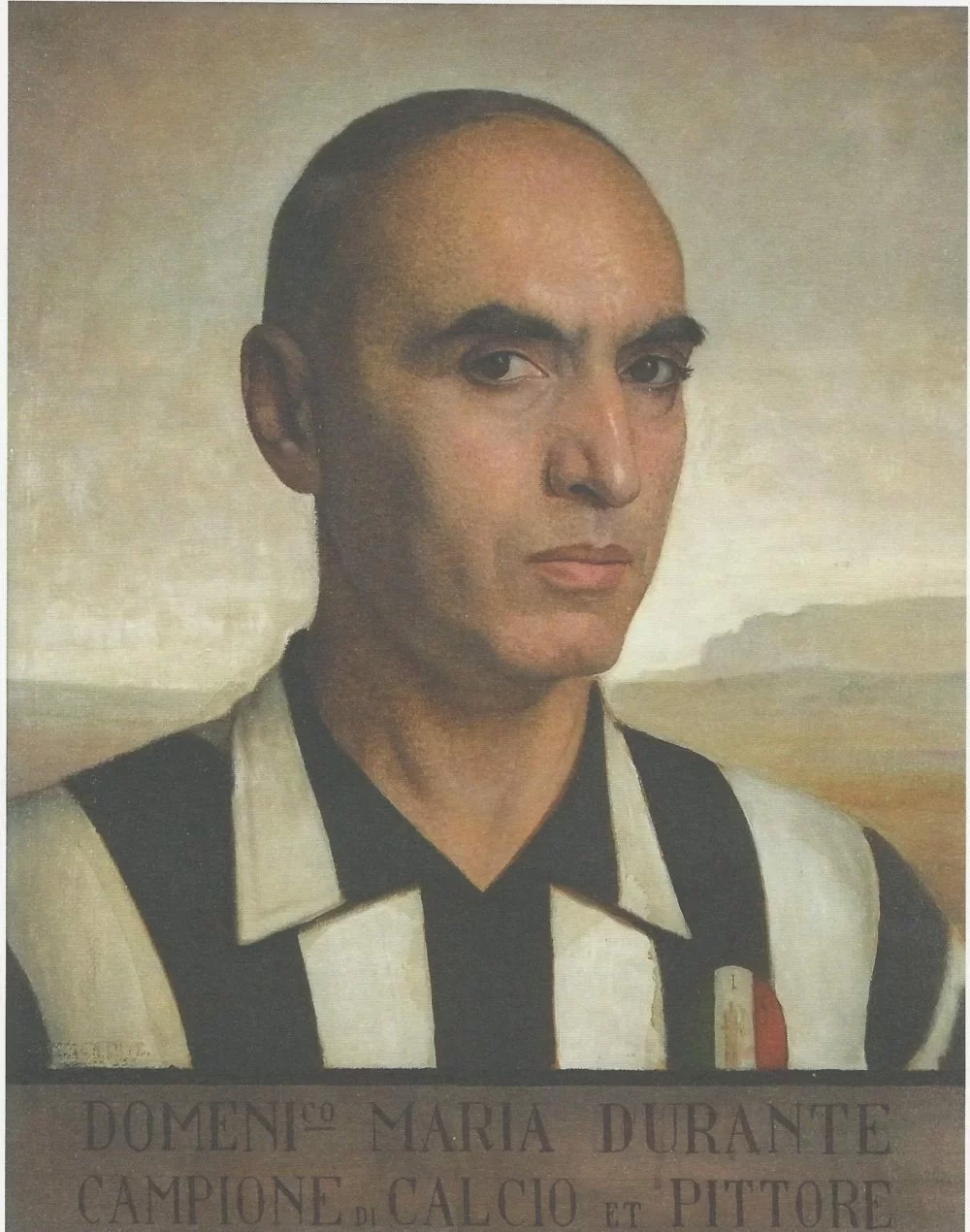 Veniamo finalmente al ritratto. Partiamo col dire che risale a un’epoca che, nelle arti figurative, vide un “ritorno all’ordine” dopo le sperimentazioni avanguardistiche anteriori alla Prima Guerra Mondiale. In realtà, Durante dall’ordine non si era mai allontanato giacché rimase sempre fedele a una pittura accademica aliena a ogni influenza dell’arte d’avanguardia, ispirata a maestri del Quattrocento italiano come Antonello da Messina, Giovanni Bellini, Domenico Ghirlandaio, ecc. Domenico Maria Durante campione di calcio et pittore è dipinto su tavola come le opere dei maestri su citati. Inoltre, rifacendosi ai ritratti quattrocenteschi di Bellini, Durante si raffigurò a mezzo busto di tre quarti su uno sfondo paesaggistico, ma lo fece con la maglia della Juventus; in basso specificò di essere “campione di calcio” e, in seconda battuta, pittore. Un autoritratto di un calciatore in stile rinascimentale: che cos’è, uno scherzo? Lo sguardo di Durante pare ben poco propenso alle burle e ci fa intuire a cosa si riferisse il suo ex compagno di squadra quando parlava di “certi occhiacci”. E allora qual è il senso di questo quadro sospeso tra modernità e tradizione? Una possibile interpretazione potrebbe essere la seguente. Già da anni in Italia si cercava di far passare l’idea che il football derivasse dall’antico calcio fiorentino, le cui prime testimonianze documentarie risalgono alla seconda metà del secolo XV, l’epoca dei maestri tanto ammirati da Durante; l’autoritratto in stile quattrocentesco potrebbe quindi essere un modo per visualizzare questa interpretazione tutta italiana delle origini del football.