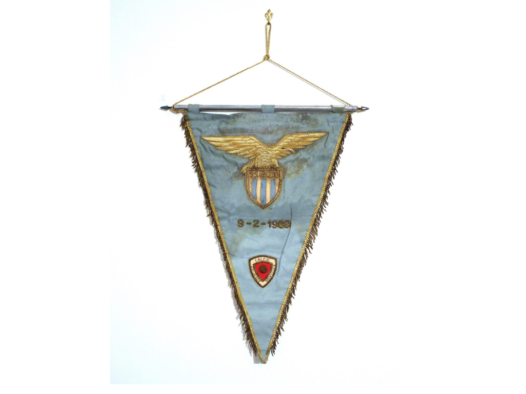 Il gagliardetto della partita, con la sua splendida aquila ad ali spiegate, è quello che la Lazio, presumibilmente per prima nei campionati nazionali, realizza anche con il simbolo della squadra avversaria. Anche altre società, negli anni successivi, presero spunto da questa novità. Soprattutto, nei tempi recenti, dove spesso si è fatto ricorso al gagliardetto con il doppio stemma. La Lazio in quel periodo faceva anche di più perché, antesignana anche in questo, usava donare agli arbitri degli incontri il proprio gagliardetto con il ricamo del nominativo del Direttore di gara. La Roma, negli anni novanta, utilizzò la stessa forma di cortesia verso gli arbitri. Anzi, la estese, anche agli assistenti a cui venivano donati gagliardetti personalizzati con il loro nominativo. Evidentemente, nel caso della Lazio, altri tempi e ben altra attenzione e cura dei dettagli nella realizzazione dei gagliardetti.