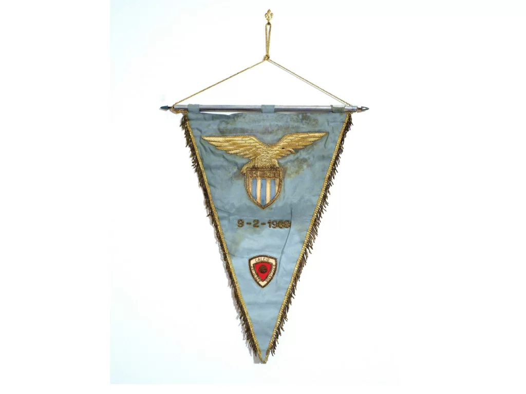 Il gagliardetto della partita, con la sua splendida aquila ad ali spiegate, è quello che la Lazio, presumibilmente per prima nei campionati nazionali, realizza anche con il simbolo della squadra avversaria. Anche altre società, negli anni successivi, presero spunto da questa novità. Soprattutto, nei tempi recenti, dove spesso si è fatto ricorso al gagliardetto con il doppio stemma. La Lazio in quel periodo faceva anche di più perché, antesignana anche in questo, usava donare agli arbitri degli incontri il proprio gagliardetto con il ricamo del nominativo del Direttore di gara. La Roma, negli anni novanta, utilizzò la stessa forma di cortesia verso gli arbitri. Anzi, la estese, anche agli assistenti a cui venivano donati gagliardetti personalizzati con il loro nominativo. Evidentemente, nel caso della Lazio, altri tempi e ben altra attenzione e cura dei dettagli nella realizzazione dei gagliardetti.