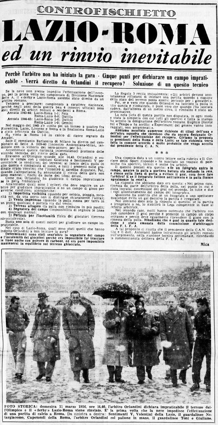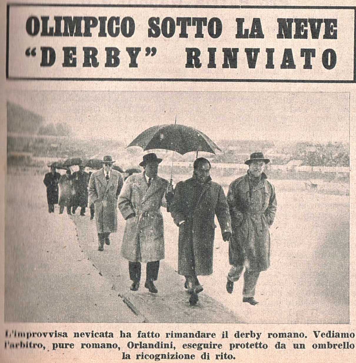 Sulla Capitale, si abbatté una vera e propria tormenta e per la prima volta l’11 marzo 1956, un derby romano venne rinviato per la neve. L’incontro viene quindi spostato al 4 aprile 1956, un mercoledì: un’altra particolarità per l’epoca, in cui si gioca solo di domenica, di giorno, con le partite che iniziano tutte in contemporanea. Il recupero del 4 aprile 1956 venne diretto, anche questa fu una novità, da un giudice di gara romano. Il giudizio sulla prestazione arbitrale venne ben sintetizzata dal “Tifone” che titolò: “Ha arbitrato Orlandini… di Lazio”.