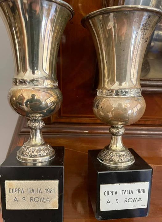 GLIEROIDELCALCIO.COM – Due coppe, un post su Facebook, quello di Luca Di Bartolomei, figlio del grande Agostino. Sono le miniature delle coppe consegnate ai giocatori a ricordo dei trofei vinti, antica tradizione tuttora in voga.
