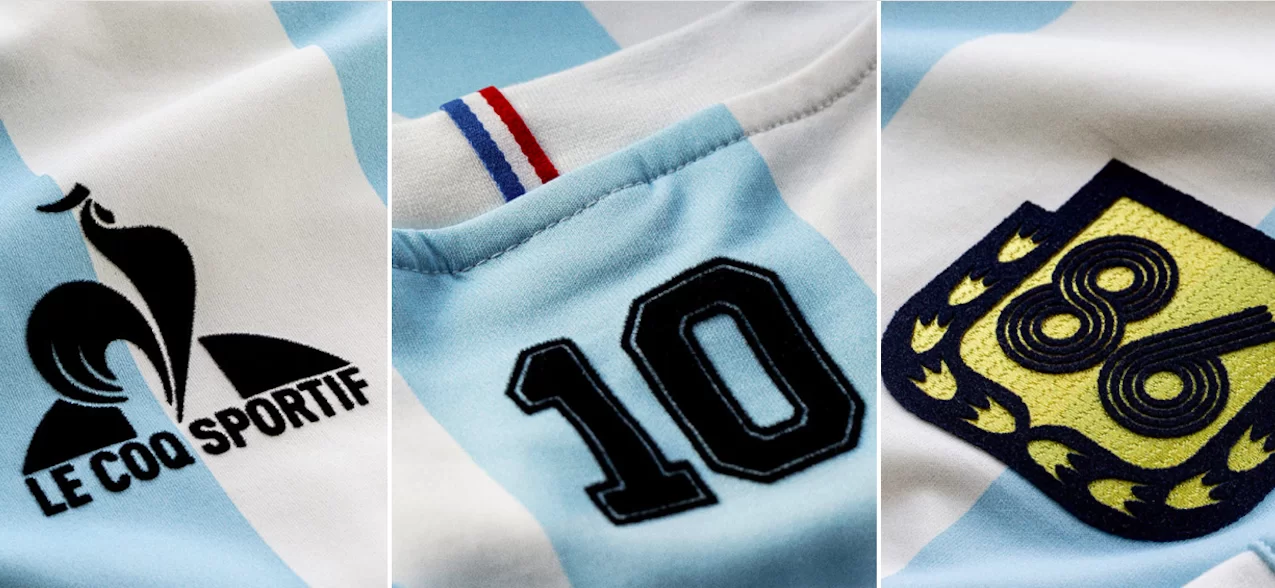 Per celebrare quel Mondiale che consacrò il dio del calcio, Le Coq Sportif realizza la serie LEGENDS, una maglietta a strisce bianche e azzurre con il nuovo simbolo dell’azienda francese ed il numero 86, stilizzato, sul petto.