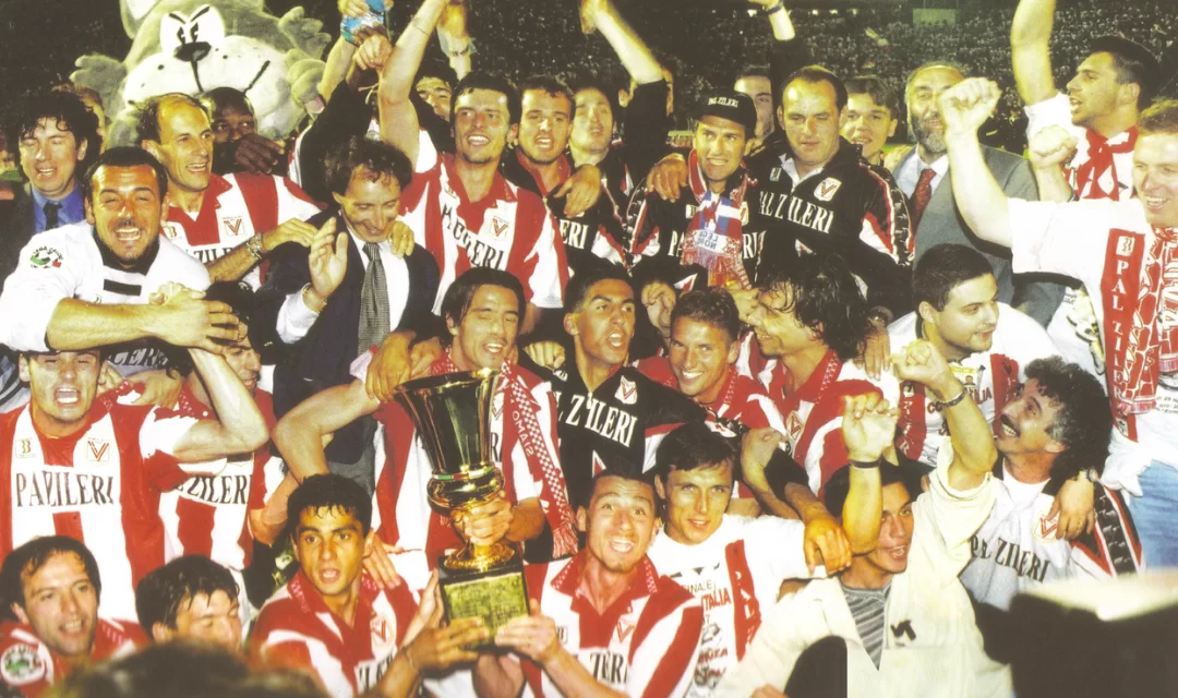 […] 1996-97. […] i veneti di un giovane Francesco Guidolin eliminano, dagli ottavi in poi, Genoa, Milan – del vicentino Baggio – e Bologna, prima della doppia finale contro il Napoli. All’andata vincono gli azzurri grazie a un gol di Pecchia, al ritorno le reti di Maini, Rossi e Iannuzzi portano la coppa a Vicenza.