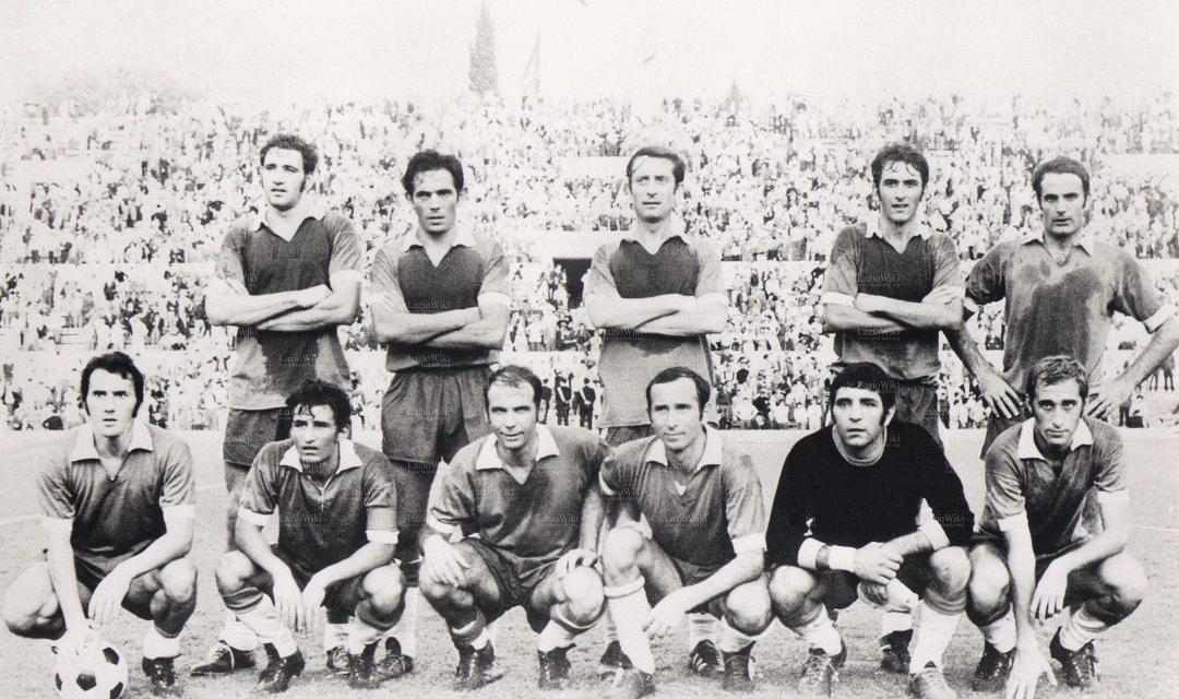 SSLAZIOFANS.IT (Stefano Greco) – Una foto in bianco e nero, d’altri tempi, che riporta alla mente un altro calcio giocato da uomini che lottavano con il coltello tra i denti in stadi stracolmi di gente e d’entusiasmo: un calcio di maglie bagnate di sangue e di sudore, realmente, non solo nelle parole del testo di“non mollare mai”. Questa è la foto scattata alla fine di un Lazio-Fiorentina del 19 ottobre del 1969: il giorno della prima doppietta di Giorgio Chinaglia in Serie A, la domenica in cui una Lazietta appena tornata tra le grandi del calcio italiano, trascinata da un gigante italiano cresciuto in Galles, si permette il lusso di battere per 5-1 una Fiorentina che gioca con lo scudetto sul petto. Quel gigante si chiama Giorgio Chinaglia, ed è stato scoperto da Juan Carlos Lorenzo, un personaggio che sembra uscito da una di quelle commedie all’italiana degli anni Sessanta: istrionico, pittoresco, ma soprattutto un po’ folle. Quella foto con i giocatori della Lazio schierati a centrocampo a fine partita per immortalare l’epica impresa, con le maglie fradice di sudore che le fanno sembrare più blu che celesti scure (con un elegantissimo colletto bianco molto british…), diventa la figurina d’apertura della pagina della Lazio dell’album di figurine dei Calciatori della Panini del 1969.