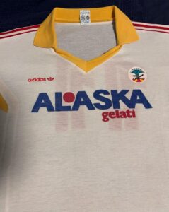 Leggermente al di sotto troviamo stampata la scritta in blu e rosso dello sponsor commerciale “Alaska Gelati”, locale azienda dolciaria, non più attiva, fondata dal cavalier Ernesto Guarini che aveva sede a Veglie, nella provincia salentina. La stessa Alaska sponsorizzava e deteneva anche la compagine di calcio femminile di Veglie che vinse tre scudetti e due Coppe Italia nel periodo dal 1981 al 1983. Alaska rimase sulle maglie del Lecce per le stagioni 1985/86 e 1986/87.