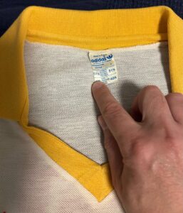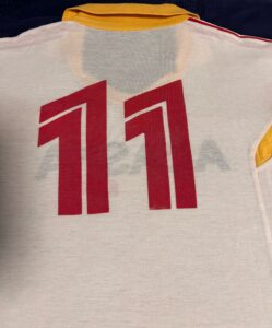 La maglia è in misto cotone e poliestere e a manica corta. La produzione è Adidas Ventex, quindi francese, ma la maglia è a tutti gli effetti una Climalite 2000 che fu un modello abbastanza innovativo per l’epoca, essendo anche leggermente traforato e quindi più sopportabile per i calciatori che lo indossavano. È di colore bianco con due piccole bande di colore giallo all’altezza delle spalle, così come è giallo anche il colletto. All’altezza delle spalle troviamo delle strisce orizzontali di colore rosso.