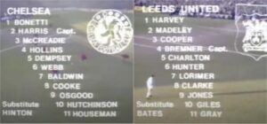 Quell’11 aprile, davanti ai “soliti” centomila di Wembley una vittoria sarebbe stata la prima volta per entrambe, ma il match finì in parità, tra errori dei portieri e il solito gioco ruvido britannico, con il Leeds due volte in vantaggio, con Jack Charlton e Mick Jones, sempre raggiunto prima da Peter Houseman e poi da Ian Hitchinson.