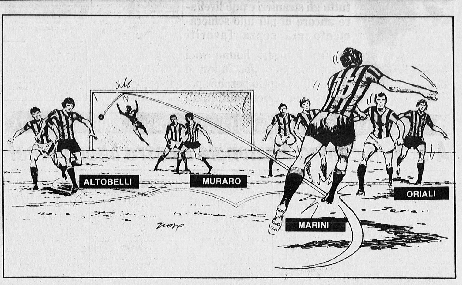 Quello che cattura l’attenzione è il disegno, tipico di quegli anni, che ricrea il gol. In questo caso la didascalia ci racconta: “Ecco come il nostro disegnatore Giuliano Giovetti ha ricostruito l'”Eurogol” di Gianpiero Marini. L’interno nerazzurro, subentrato al 63′ a Pasinato, riceve l’appoggio all’indietro di Altobelli e fa partire un formidabile tiro che picchia all’interno della traversa e finisce alla spalle del portiere del Real Sociedad Arconada”.