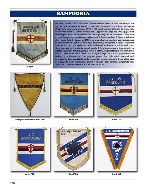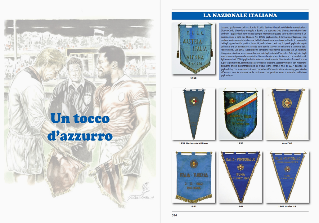 Scritto dopo tre anni di lavoro e grazie al costante supporto dell’editrice Geo Edizioni, l’opera è anche arricchita di numerosi articoli che riportano attraverso i gagliardetti al calcio giocato poiché testimonianza di innumerevoli incontri. Ecco pertanto che è bello narrare la storia del gagliardetto Roma – Novara, l’esemplare scambiato tra Piola e Maestrelli che pose fine ai clamori suscitati pochi mesi prima alla gara di campionato tra le due squadre i cui esiti finirono, addirittura, in aula a Montecitorio. Ma anche storie di squadre poco conosciute come la Bondenese, compagine nel ferrarese, che cita la strega Zanobia che campeggia sul gagliardetto, leggendo il libro capirete perché, aneddoti come quello del primo gagliardetto utilizzato in campo, curiosità sulla produzione, manifattura e tipologia dei gagliardetti e tante altre citazioni attraverso cui con i gagliardetti si parla anche di arte (i Maestri Guercino e Giorgione presenti sui gagliardetti della Centese e del Giorgione), di Santi, animali (il gallo dell’Asti, il cavallo del Napoli, il gallo del Bari) ed eroi come Erminio Giana ufficiale deceduto nella Prima Guerra mondiale il cui nome è ancora associato alla squadra di Gorgonzola.
