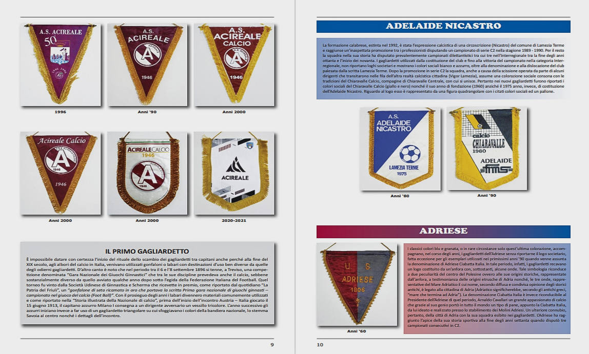 Il libro deriva da un progetto che ha voluto raccogliere i gagliardetti di tutti le maggiori squadre di calcio nazionali quelle che hanno disputato i campionati di serie A – B e C dal loro consolidamento/ristrutturazione. Praticamente, nel caso della Serie A e B, dal 1929 al 2022. Le 608 pagine complessive del libro, che raccolgono circa 4000 foto di gagliardetti appartenenti alla collezione di Marco Cianfanelli, sono un condensato della storia dello sport più amato ma anche l’opportunità per conoscere e scoprire davvero tante curiosità. Ad esempio il significato del rosso e blu che campeggia sui gagliardetti del Campobasso oppure del granata del Torino ed ancora i “tre giganti della Valle dei Templi” simbolo cittadino di Agrigento ma anche effige presente sui gagliardetti dell’Akragas, il prode Achille che si staglia sullo stemma dei gagliardetti del Chieti, il veliero in navigazione sulle acque limacciose dell’Adige nei gagliardetti del Legnago a ricordo dell’impresa degli Argonauti.