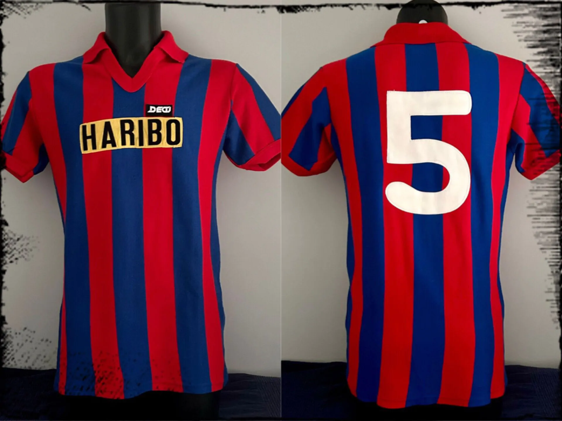 È una maglia in lanetta, con larghe bande verticali rosse e azzurre, prodotta dalla Degj (il cui stemma è in un piccolo riquadro sulla parte di destra della maglia). Sulla parte centrale troviamo lo sponsor commerciale, la nota azienda dolciaria tedesca Haribo, ancora oggi attiva e famosissima per le sue gustosissime. Il marchio prende il nome dalle iniziali del suo fondatore, Hans Riegel, e Bonn, località dove è nata l’azienda, e dove tutt’ora ha sede. La scritta Haribo è all’interno di una toppa gialla cucita alla maglia. Altro particolare eccezionale è il numero 5 in similpelle sul retro. Maglia in condizioni eccezionali.