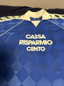 Al centro, stampato in vernicetta, troviamo lo sponsor commerciale che è il locale istituto bancario, la Cassa di Risparmio di Cento, fondata nel 1844 e poi fusa nell’attuale Credito Emiliano (Credem). La Cassa di Risparmio di Cento comparve sulle maglie della formazione biancoazzurra a partire dalla stagione 1987-88, sostituendo lo storico sponsor “Benassi”.