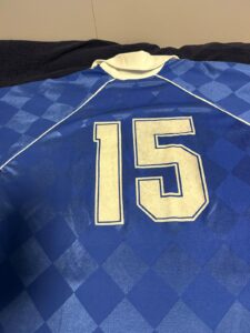 E’ di colore blu chiaro con dei quadrati, alcuni più chiari ed altri più scuri, all’interno della trama della maglia. Il colletto e i polsini sono di colore bianco, mentre sulle spalle troviamo una banda bianca dove ricorre, ripetuta, una foglia stilizzata, che dovrebbe essere lo stemma del produttore della maglia che, al momento, mi risulta sconosciuto (purtroppo l’etichetta all’interno della maglia non è molto leggibile).