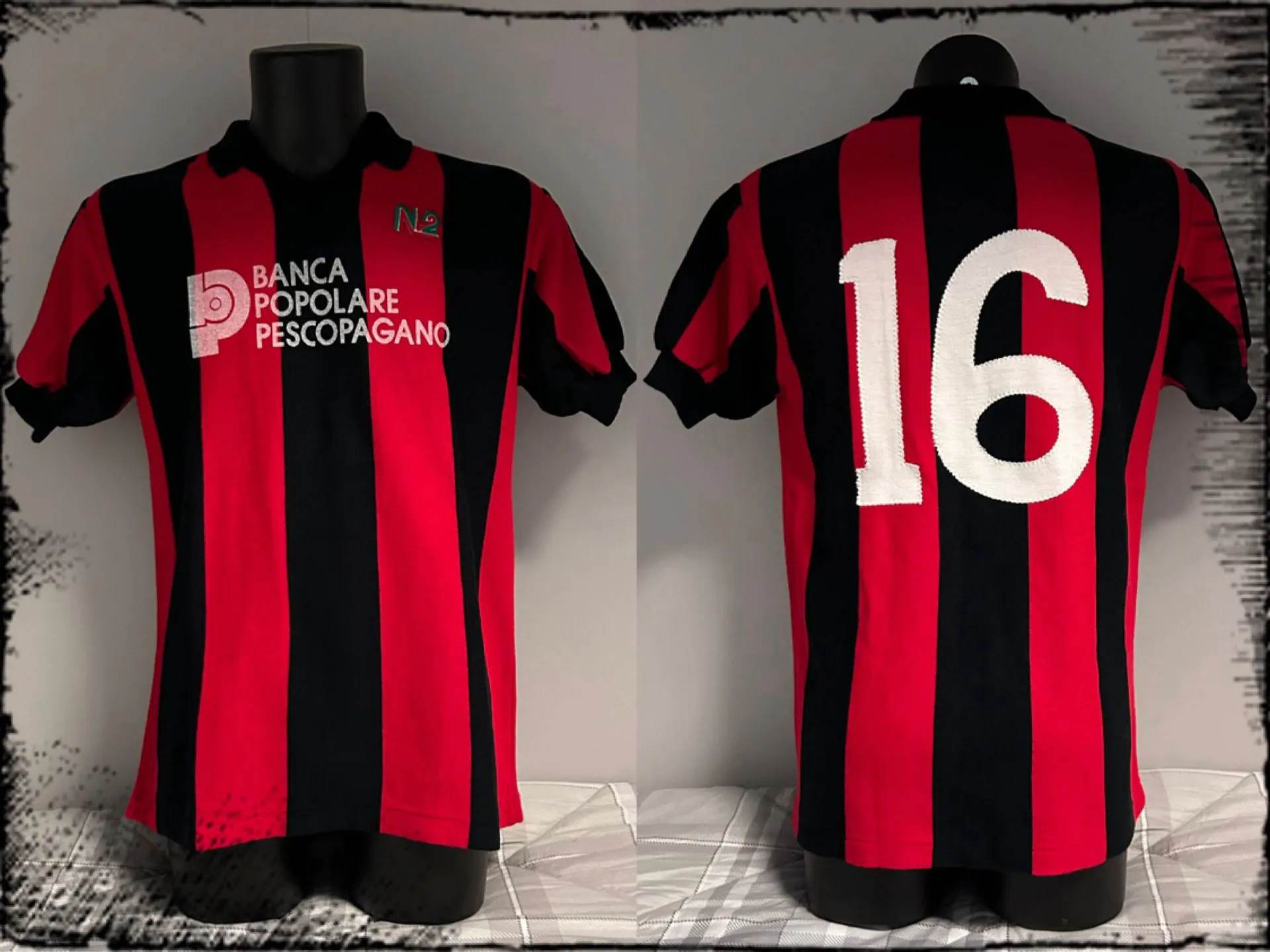 Questa è la classica maglia “home” con gli iconici colori rossoneri. E’ una maglia in lanetta a fasce larghe rosse e nere, con banda nera centrale e colletto anch’esso di colore nero. La maglia è stata prodotta da Ennedue, il brand che Nicola Raccuglia, fondatore della più famosa Ennerre, aveva creato dopo l’uscita dalla Ennerre che rimase in attività in mano agli altri soci rimasti.