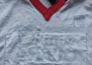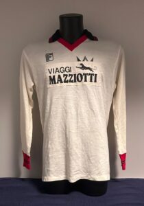 La maglia è una bellissima “lanetta” marchiata Fashion Sport, azienda di Sant’Egidio alla Vibrata (TE). E’ una maglia invernale da trasferta a manica lunga che presenta il colletto nero con due strisce rosse ai bordi, mentre la base del colletto è rossa. I polsini sono esattamente speculari al colletto, vale a dire rossi con due strisce nere che si collocano esattamente al centro.