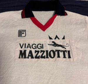 Al centro della maglia troviamo il cosiddetto “doppio sponsor”: infatti, come si può notare, troviamo una toppa cucita alla maglia con lo sponsor commerciale “Viaggi Mazziotti” che reca come simbolo una pantera: si tratta di una nota agenzia di viaggi di Lanciano che risulta tuttora in attività. La toppa copre lo sponsor della stagione precedente 1986/87, quello della cooperativa vinicola “Vini Citra” che avevamo visto sulla maglia rossonera presentata nelle settimane scorse. A differenza della maglia rossonera, qui il carattere della vernicetta dello sponsor è nero e con i caratteri leggermente più grandi. Si tratta quindi di un altro caso di “riciclo” della maglia utilizzata in stagioni precedenti.