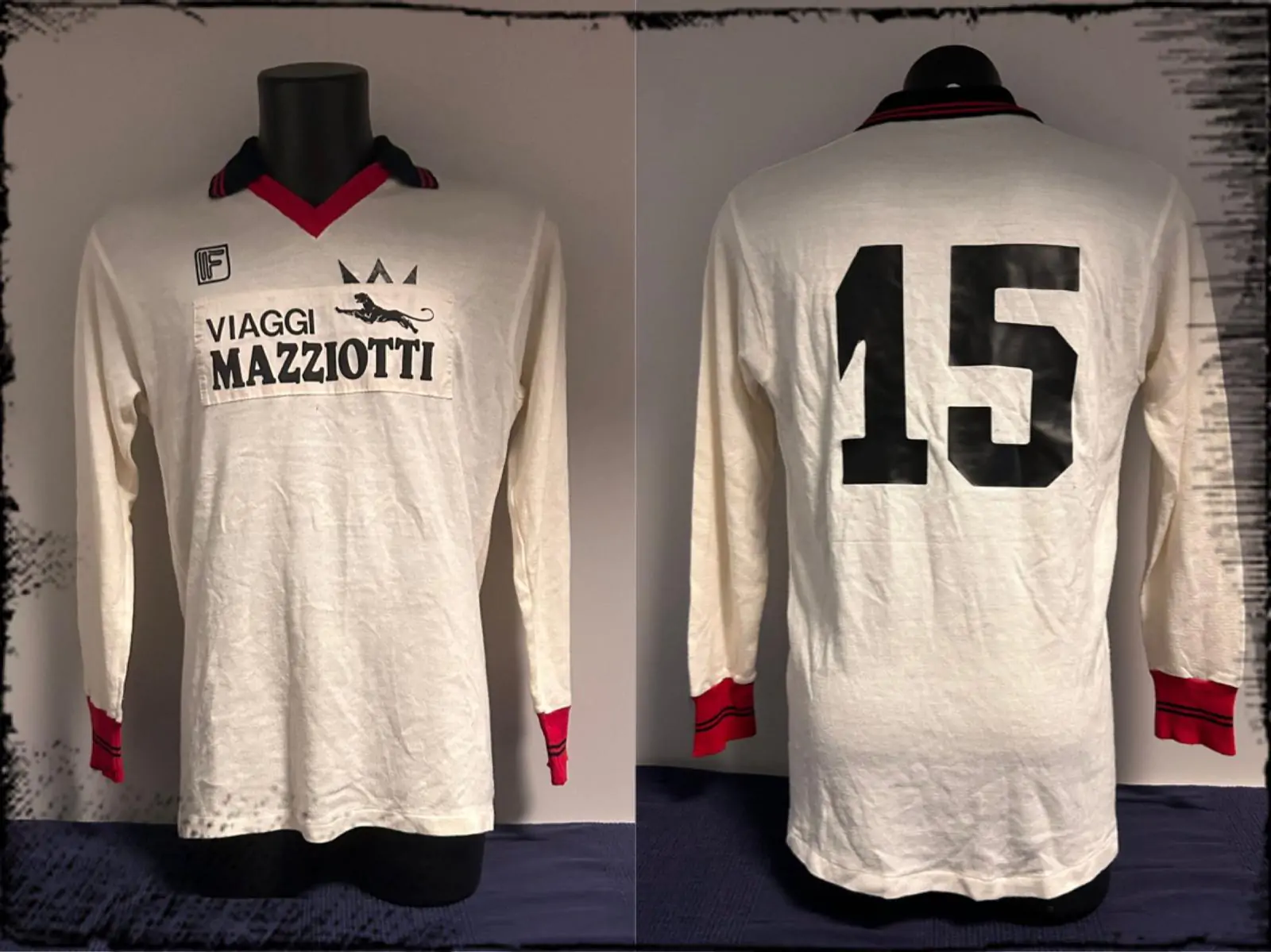 La maglia è una bellissima “lanetta” marchiata Fashion Sport, azienda di Sant’Egidio alla Vibrata (TE). E’ una maglia invernale da trasferta a manica lunga che presenta il colletto nero con due strisce rosse ai bordi, mentre la base del colletto è rossa. I polsini sono esattamente speculari al colletto, vale a dire rossi con due strisce nere che si collocano esattamente al centro.