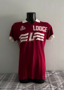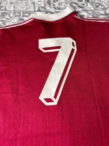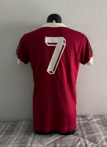 Si tratta di una maglia molto rara, a manica corta, di colore amaranto con colletto superiore e polsini bianchi in un tessuto acrilico leggero. Sulle spalle e fino al bordo manica troviamo delle strisce bianche che ricordano molto le maglie di produzione Adidas.