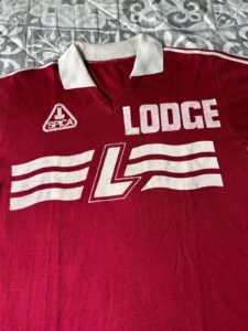 Nella parte superiore della maglia, troviamo, stampati in vernicetta bianca, non uno ma addirittura due diversi sponsor commerciali. Gli ammortizzatori Spica e le candelette Lodge. Con ogni probabilità uno dei primi casi, se non il primo, di maglia italiana degli anni Ottanta con due diversi sponsor commerciali.