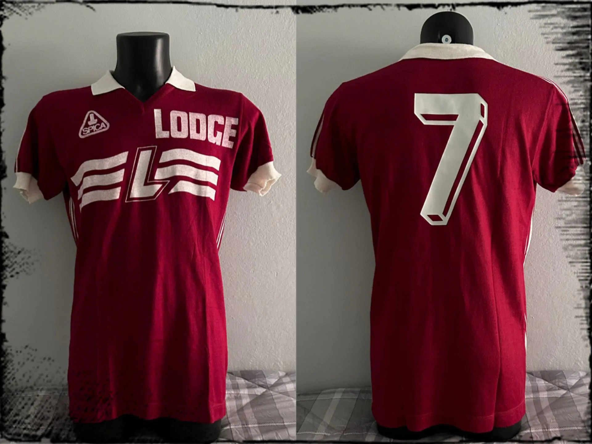 Nella parte superiore della maglia, troviamo, stampati in vernicetta bianca, non uno ma addirittura due diversi sponsor commerciali. Gli ammortizzatori Spica e le candelette Lodge. Con ogni probabilità uno dei primi casi, se non il primo, di maglia italiana degli anni Ottanta con due diversi sponsor commerciali.