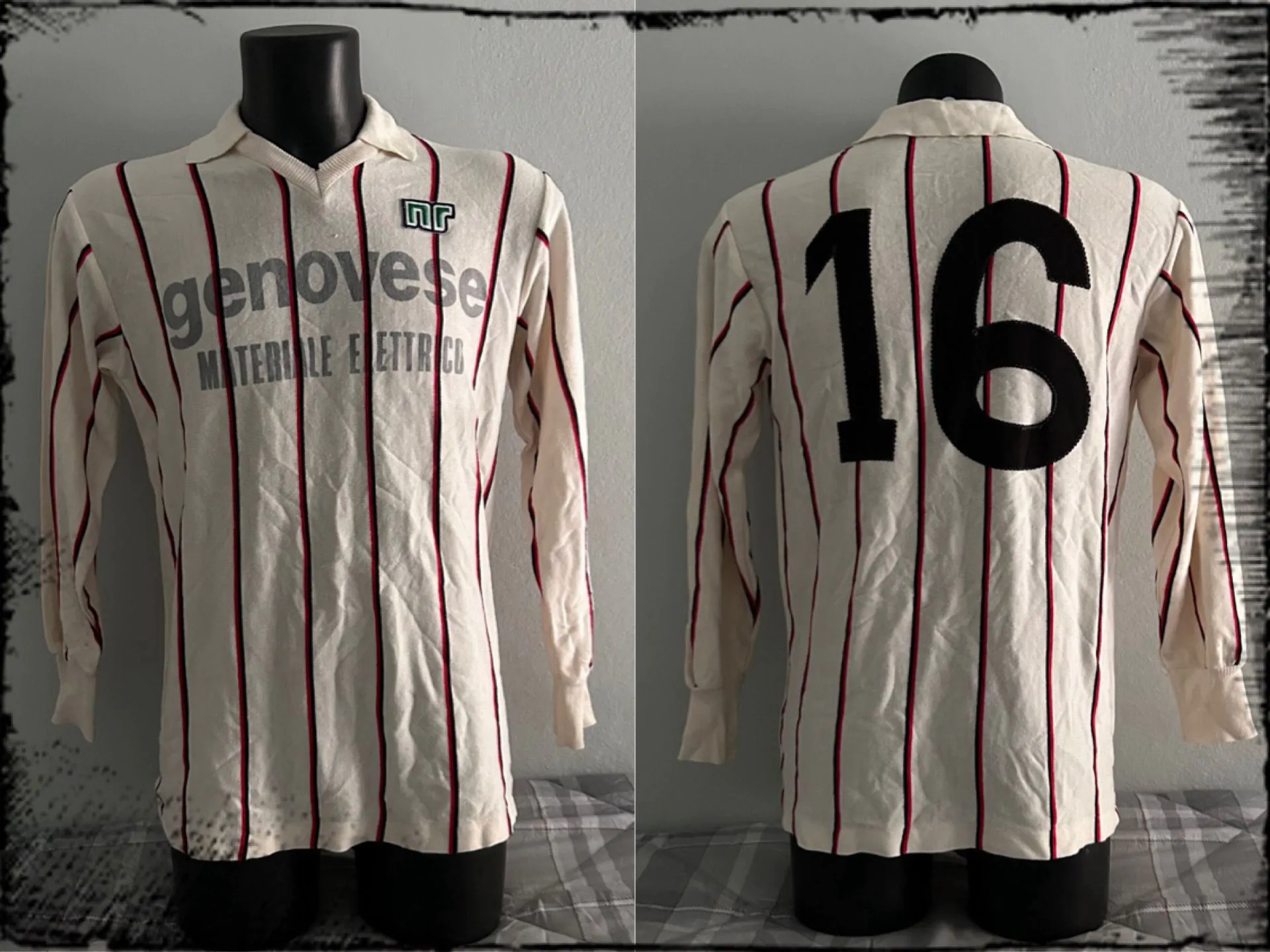 Si tratta di una bellissima lanetta a manica lunga prodotta da Ennerre. Una maglia da trasferta su sfondo bianco con righine verticali di colore rosso e nero, per richiamare i colori sociali del club di Nocera Inferiore.